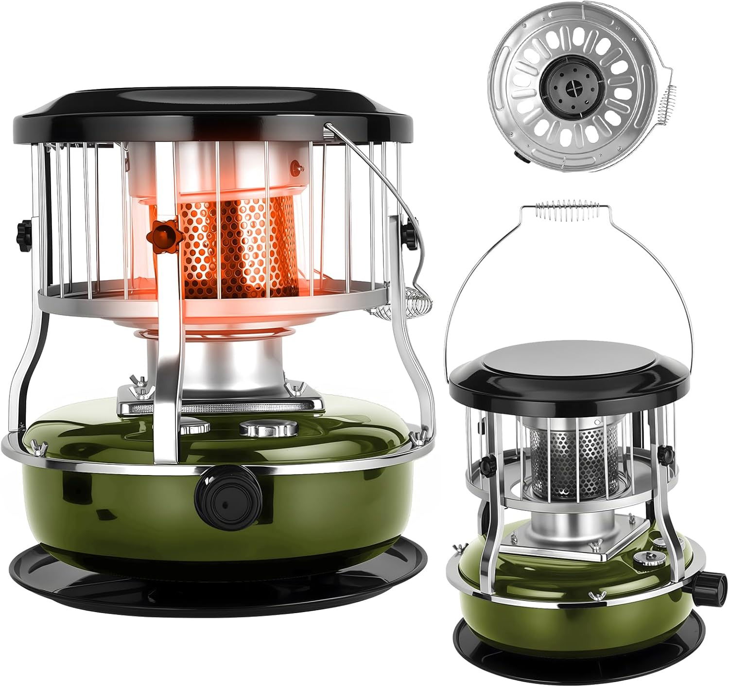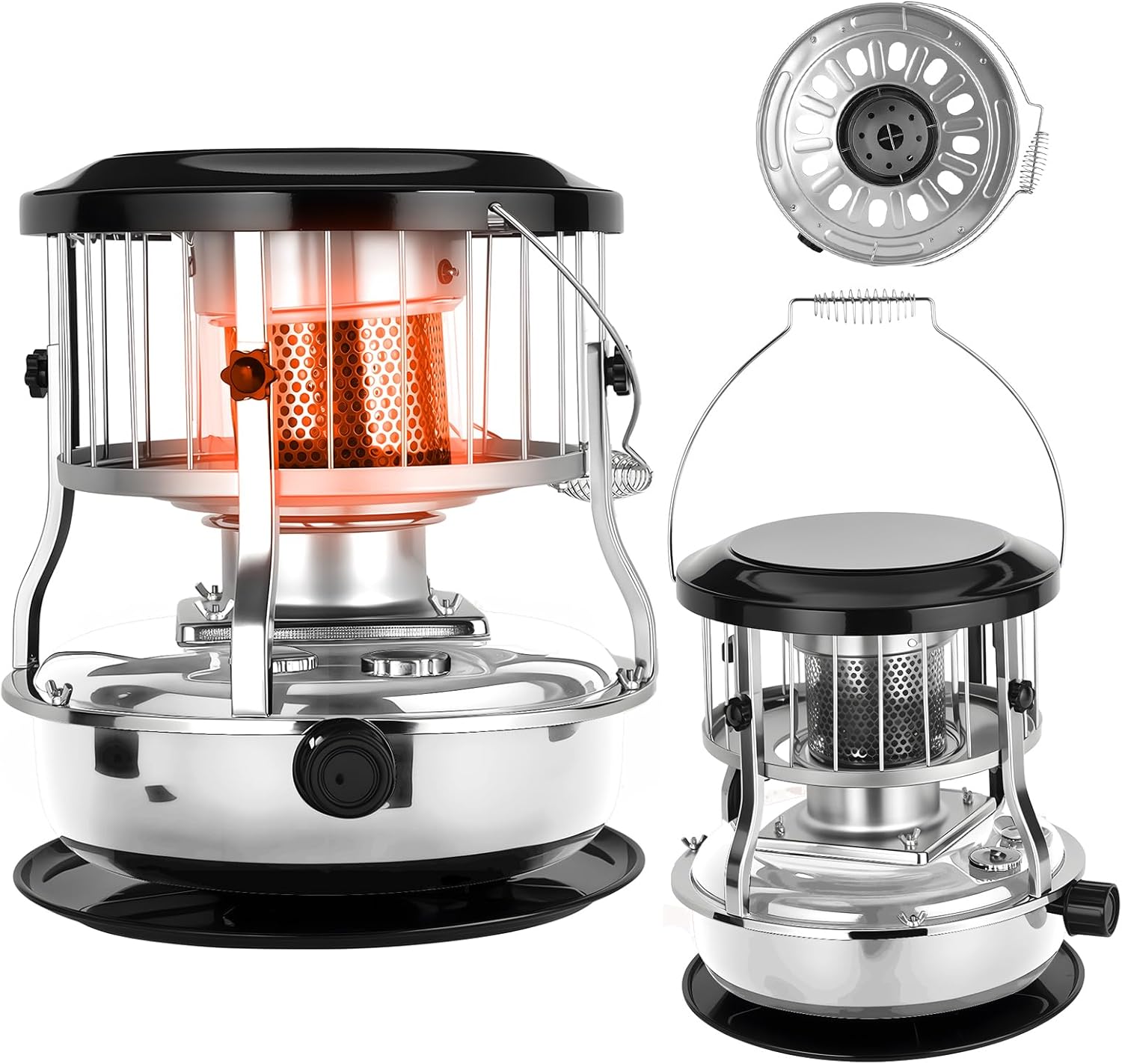 [2-in-1 Kerosene Heater & Cooking Stove]: Serves as a 9000 BTU radiant heater to warm 15-sqm rooms at night, while doubling as a cooker for boiling water or preparing meals during daytime camping or home use. Combines heating and cooking needs in one stainless steel appliance.[Prolonged Long Burn Duration]: 4.5L fuel capacity delivers continuous warmth and cooking capability for an extended period, minimizing frequent refueling. Ideal for long camping trips, power outages, or overnight indoor use where consistent comfort is needed.[Non-Electric Radiant Heating]: Operates without electricity, featuring manual knob control and radiant heating technology. Reliable for emergency scenarios like blizzards or remote areas, providing consistent heat without power dependency.[Portable Stainless Steel Handle]: Equipped with an ergonomic stainless steel handle for easy repositioning. Compact 12.99"x12.99"x18.11" size allows moving between home, garage, or outdoor campsites effortlessly.[Indoor & Outdoor Multi-Scenario Use]: Suitable for enclosed spaces like living rooms or cabins, and open-air activities such as camping, ice fishing, or hunting. Adapts to diverse environments for versatile heating and cooking needs.Item Name: Kerosene HeaterMaterial: Stainless SteelHeat Output: 9000 BTUFuel Capacity: 4.5LBurn Time: 16-21 HoursHeating Method: RadiantFeatures: Portable, Non-electric, Radiant HeatingSize Details:L: 33cm/12.99", W: 33cm/12.99", H: 46cm/18.11" (Approx.)Notes:Due to the light and screen setting difference, the item's color may be slightly different from the pictures.Please allow slight dimension difference due to different manual measurement.Package Includes:1 x Kerosene Heater